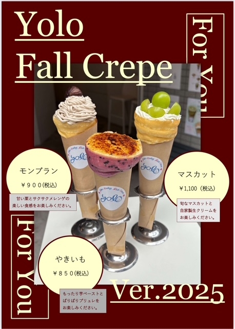 yolo fall crepe 秋クレープ販売中です💛「食欲の秋」ということで、yoloの秋期間限定クレープで、秋を感じてください🍂〇モンブラン ¥900(税込)〇やきいも ¥850(税込)〇マスカット ¥1,100(税込) モンブラン やきいも マスカット